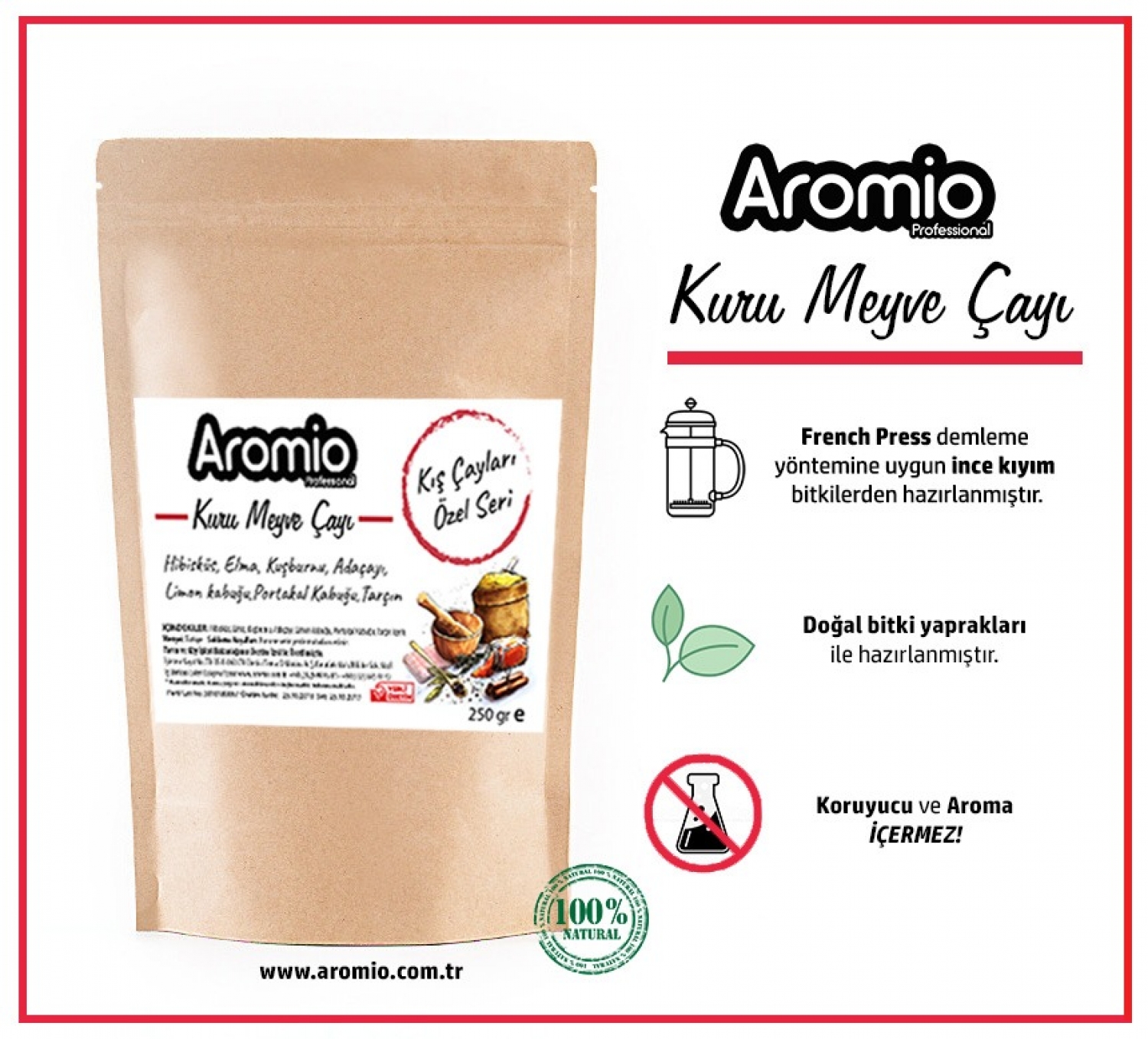Aromio karışık meyce çayının 15 gramını 250 ml sıcak su ile French Press de hazırlayıp bu lezzetin siz de keyfine varabilirsiniz.